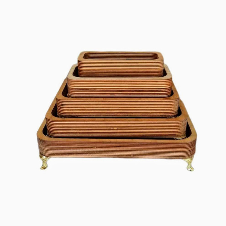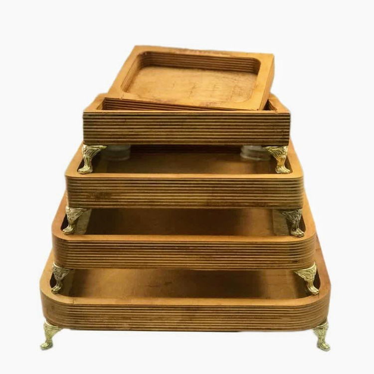 ست 5 عددی سینی پذیرایی چوبی پایهدار طرح مستطیل، تلفیقی بینظیر از زیبایی طبیعی چوب و جلوه لوکس فلز، برای ارتقاء سطح دکوراسیون و پذیرایی شماست.